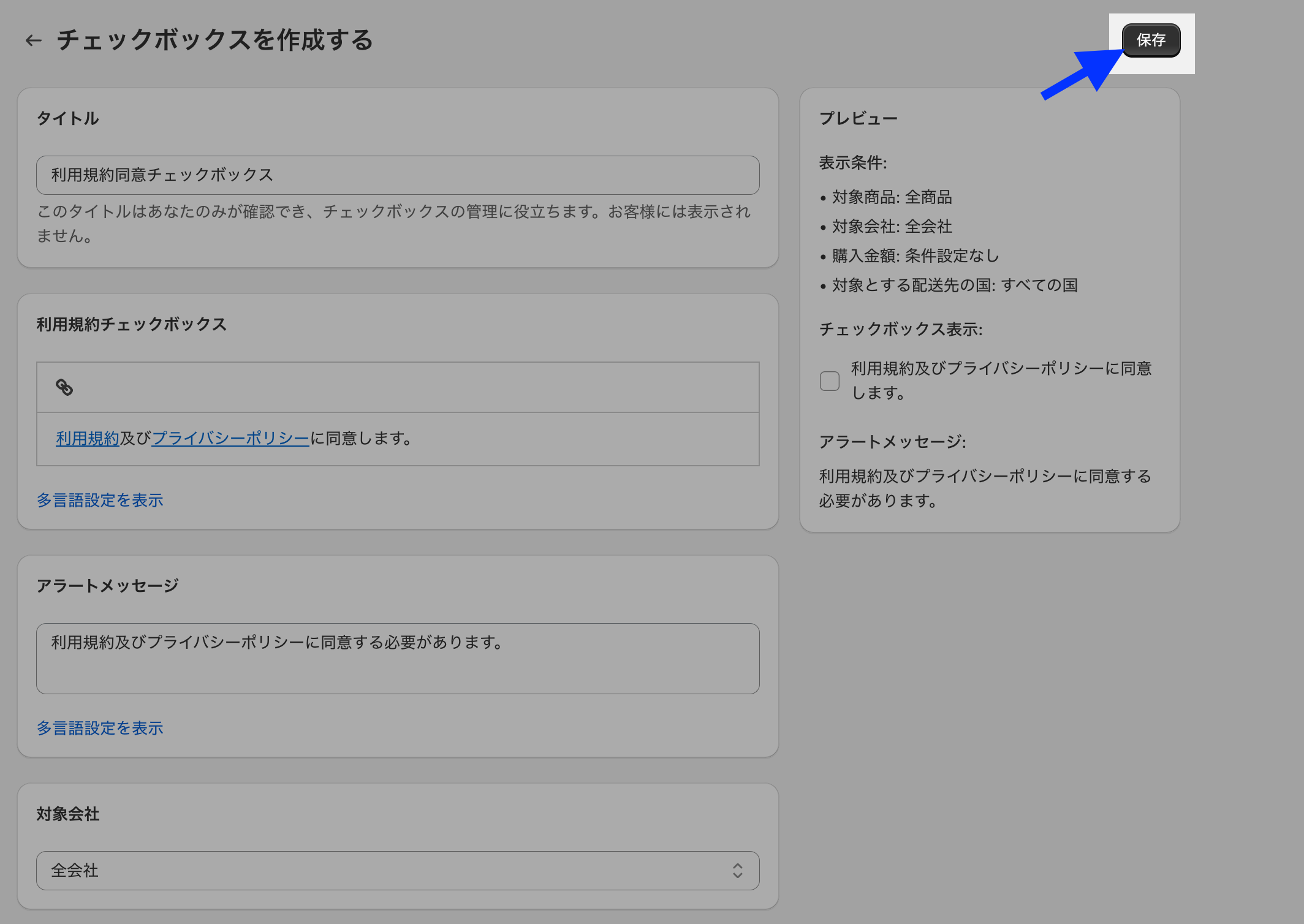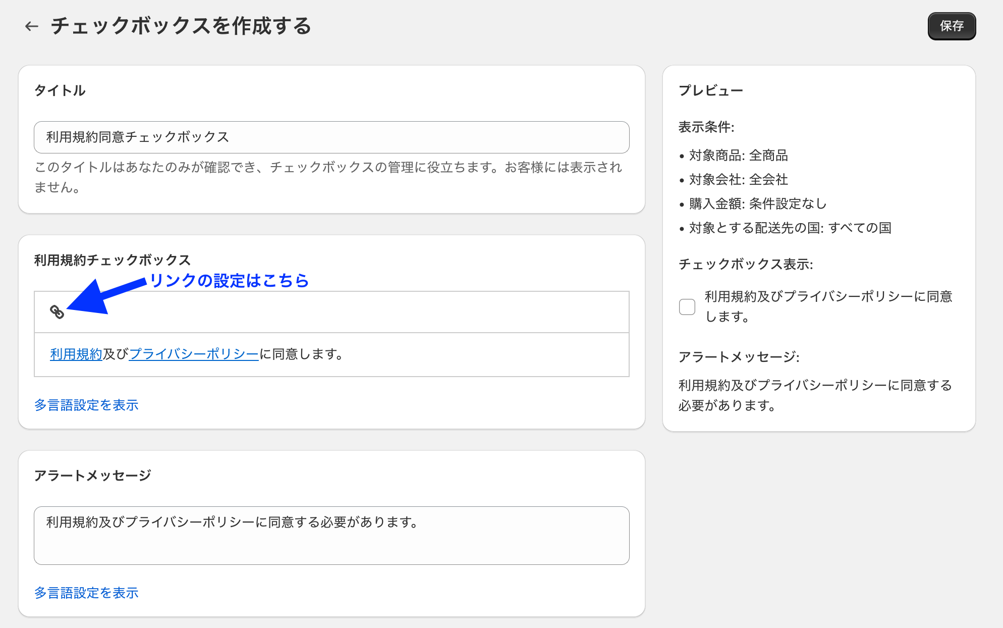 「多言語設定を表示」をクリックすると多言語対応も可能