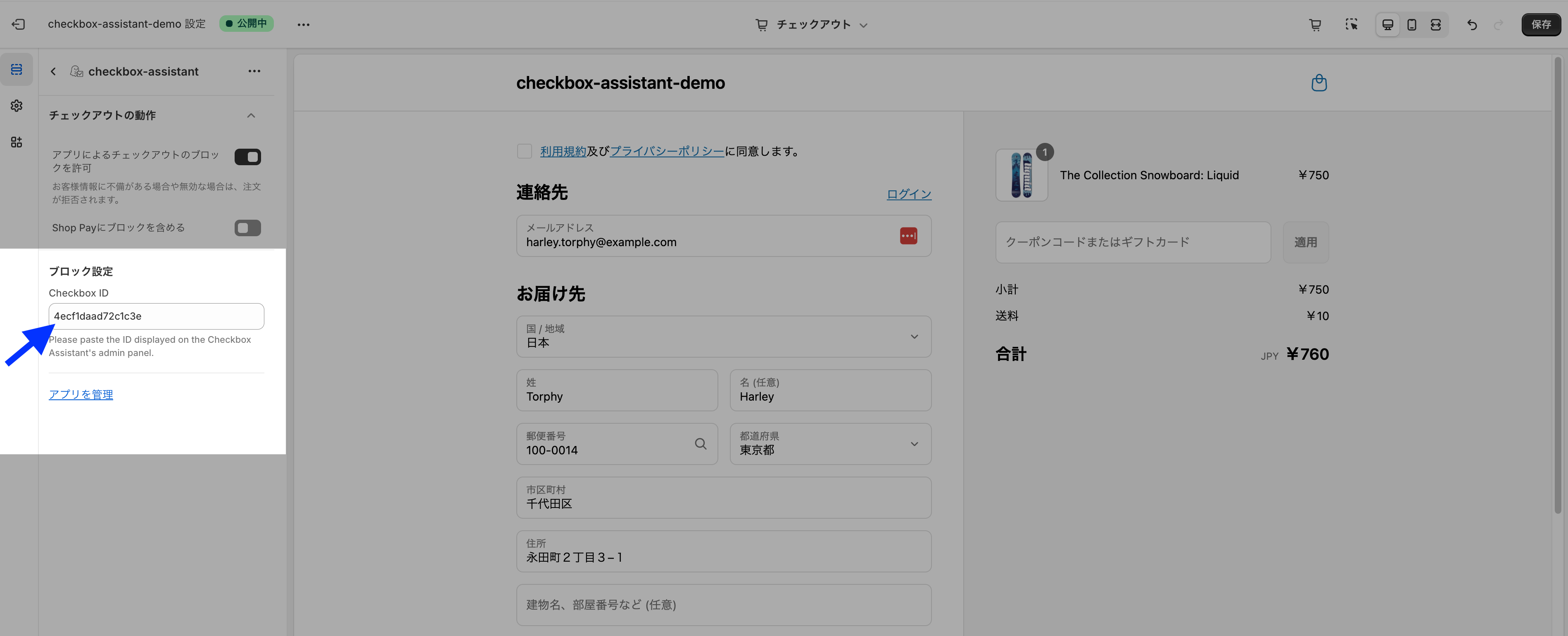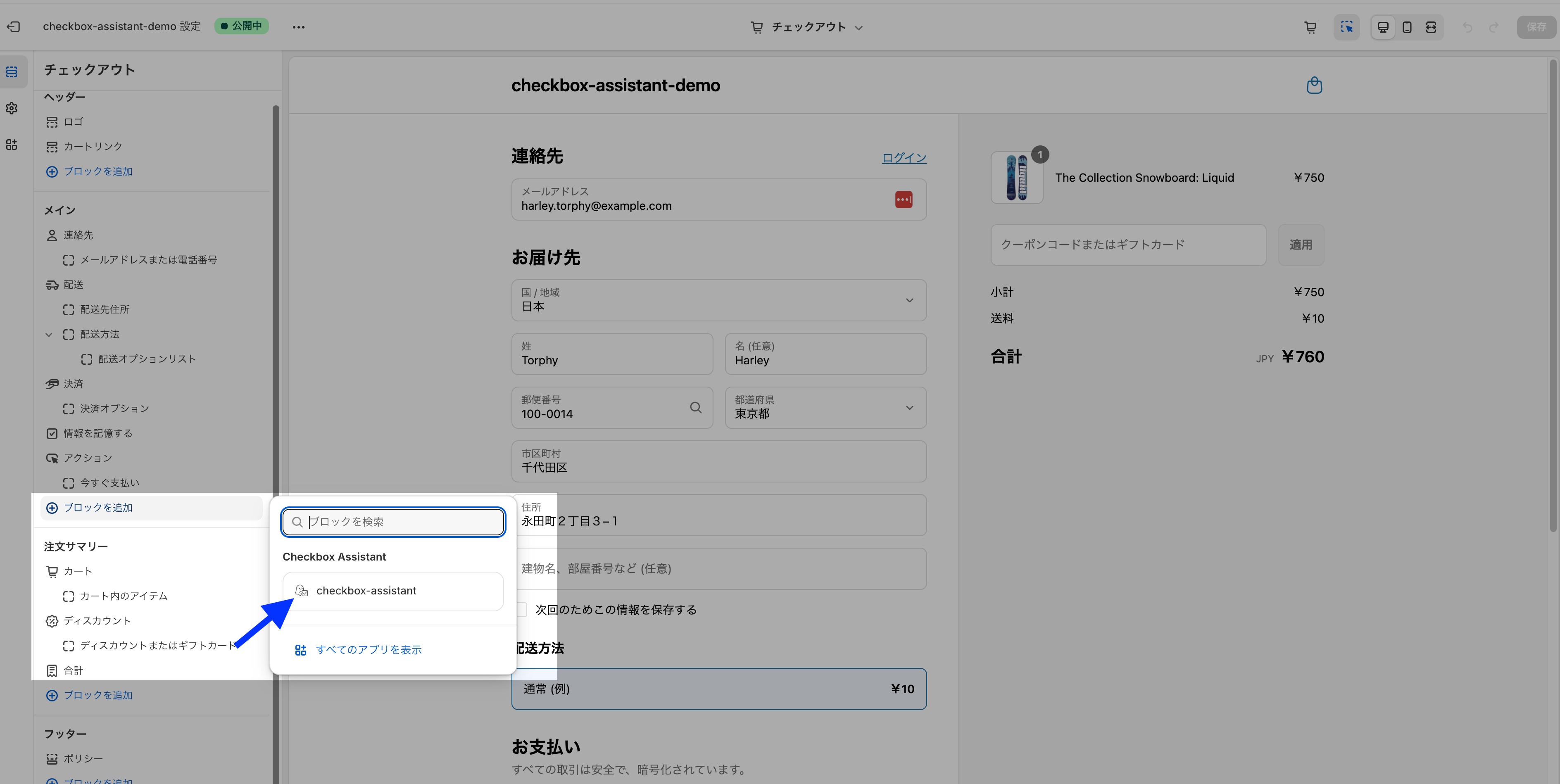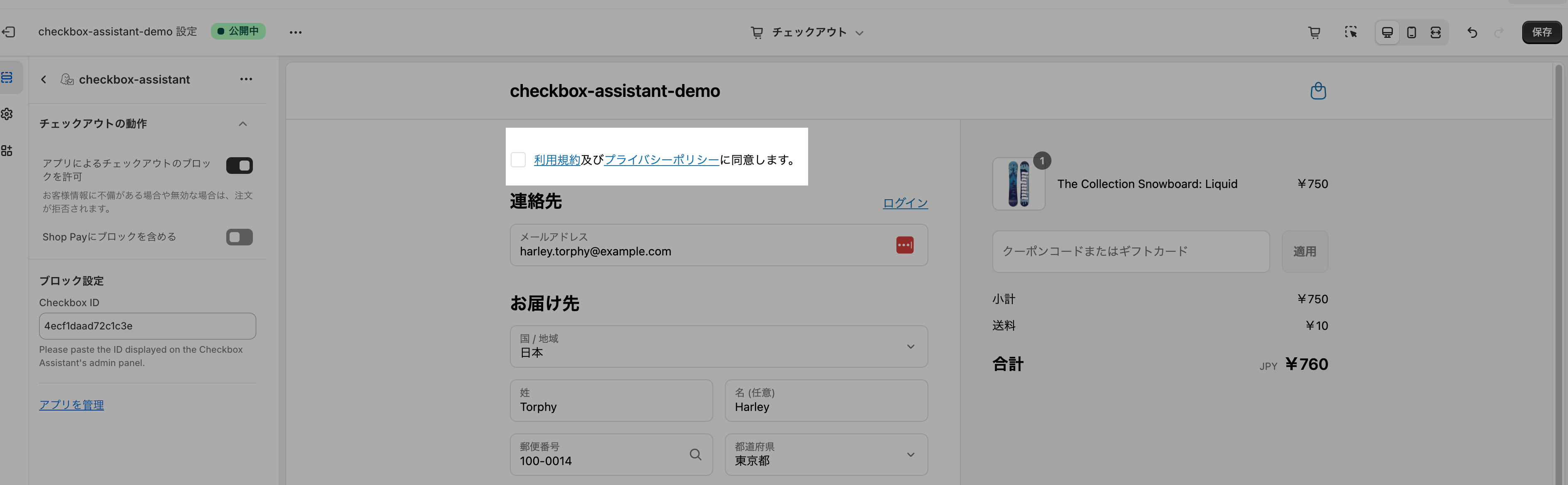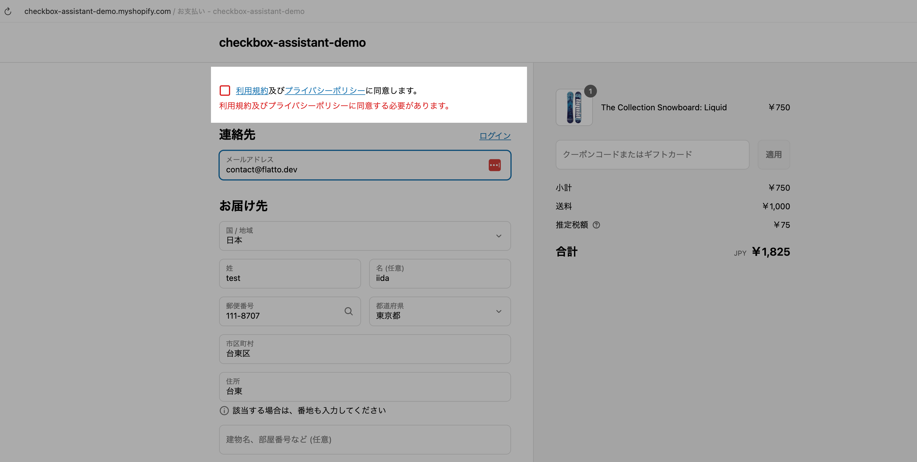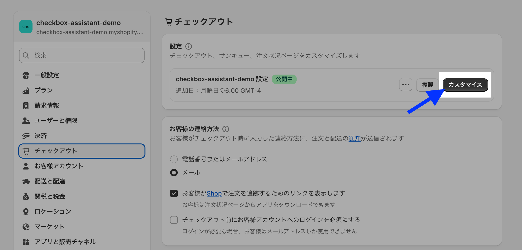 アラートメッセージは、チェックアウトの設定画面では確認できないため、実際のストアのチェックアウト画面で確認します。