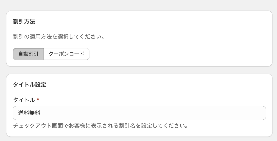 割引方法は、自動割引、クーポンコードのお好きなほうを選択してください。