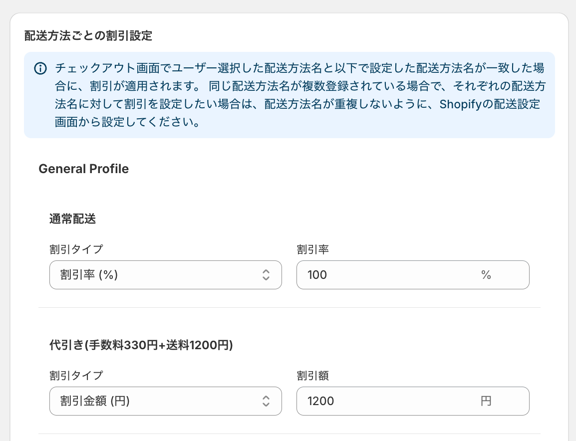 各配送方法に対して、割引率または割引金額の設定をしてください。