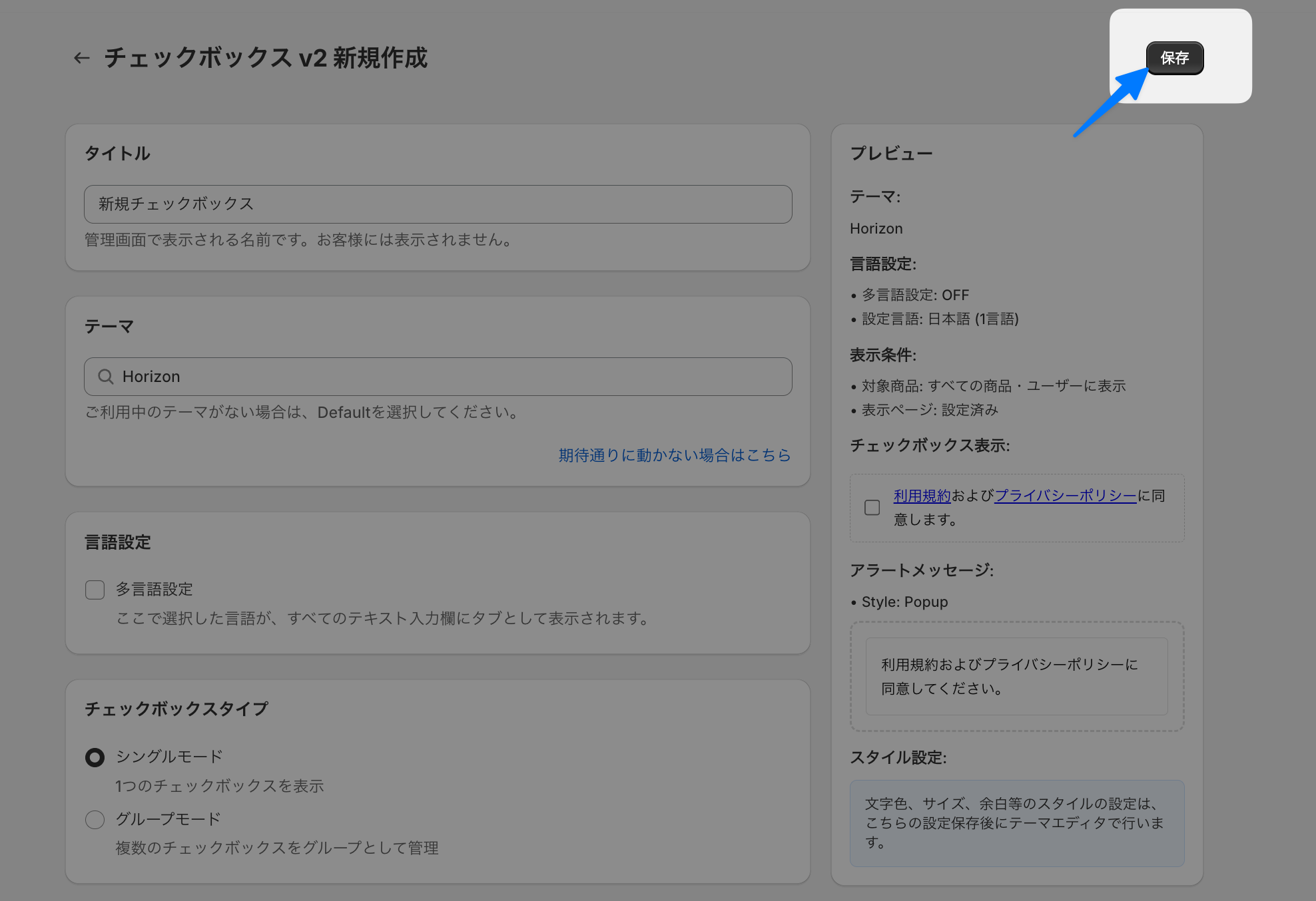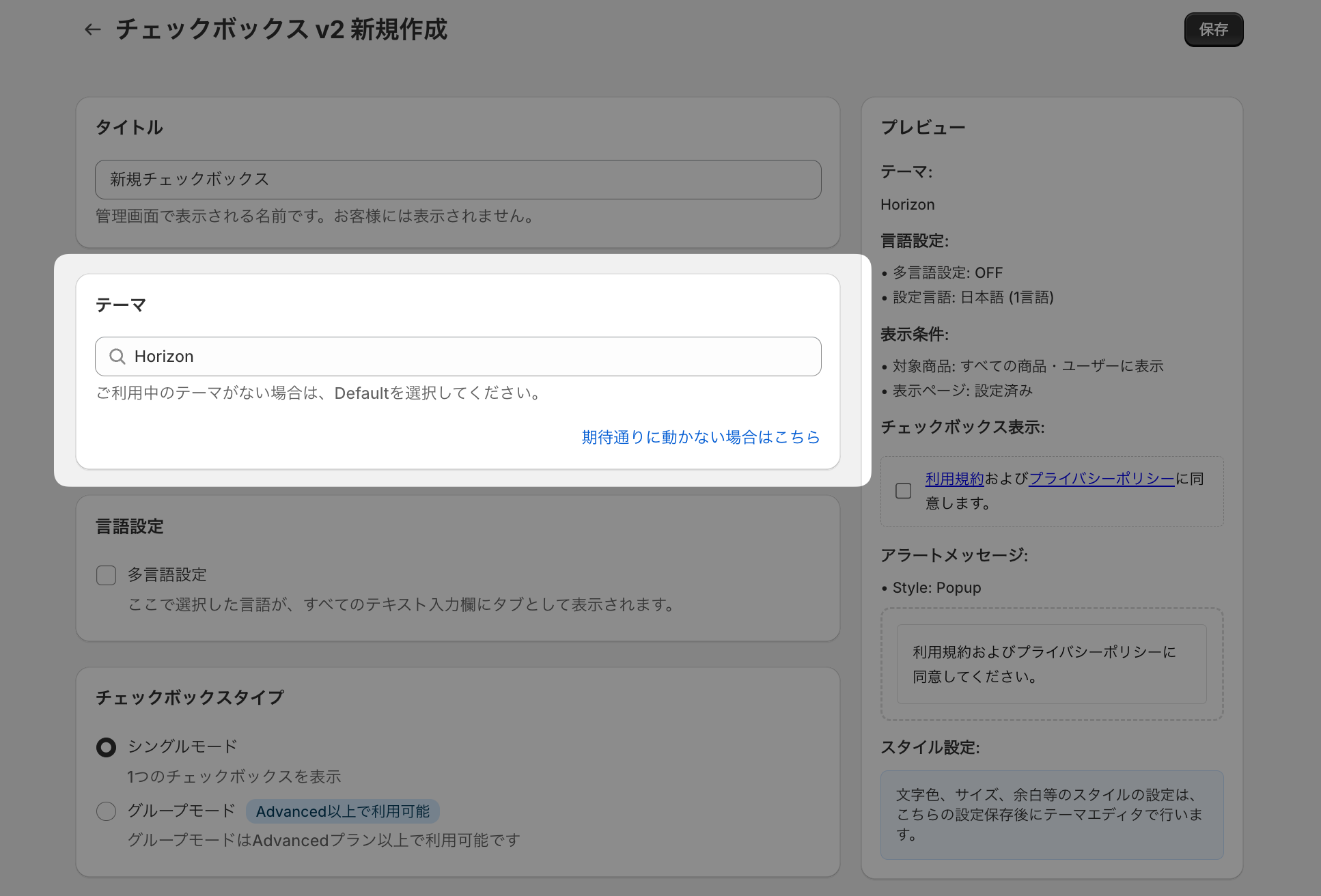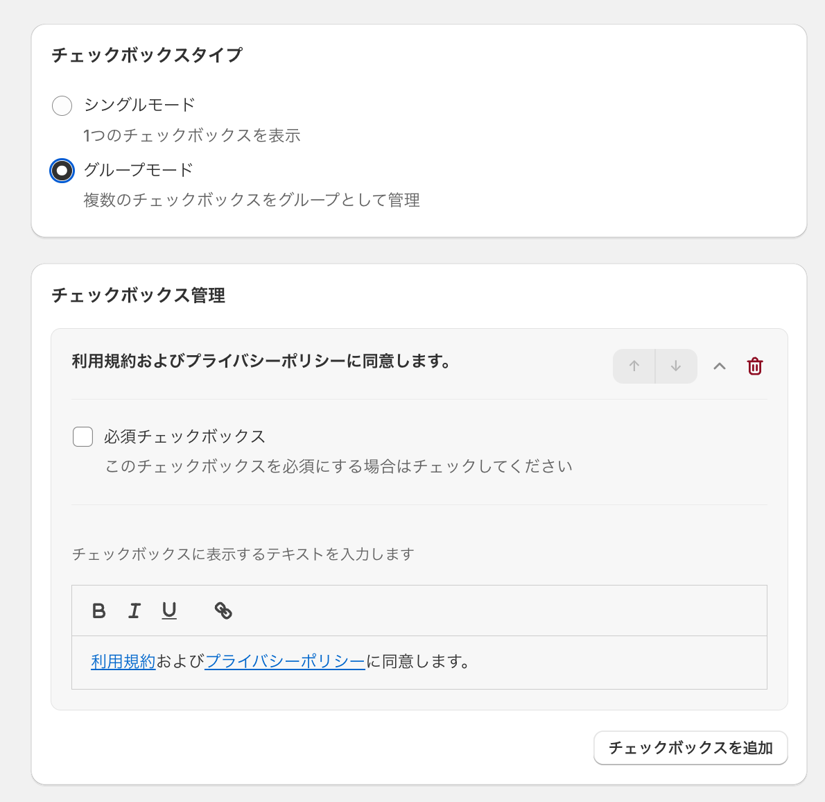複数のチェックボックスを表示したい場合は、グループモードを選択。