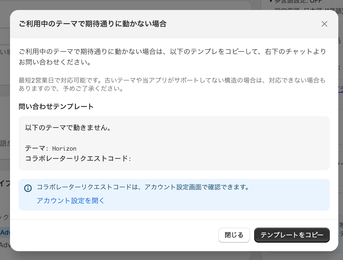 Defaultで動かない場合は、「期待通りに動かない場合はこちら」をクリックして、問い合わせテンプレートをコピーして、テーマ及びコラボレーターリクエストコードを記入して、右下のチャットよりお問い合わせください。