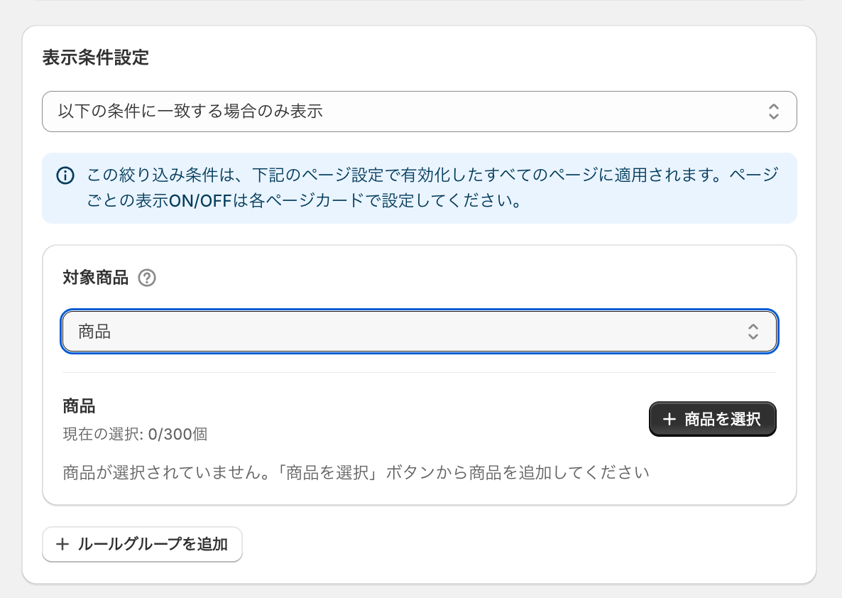 商品、バリエーション、商品タグ、顧客タグによって、表示条件を制御することが可能です。