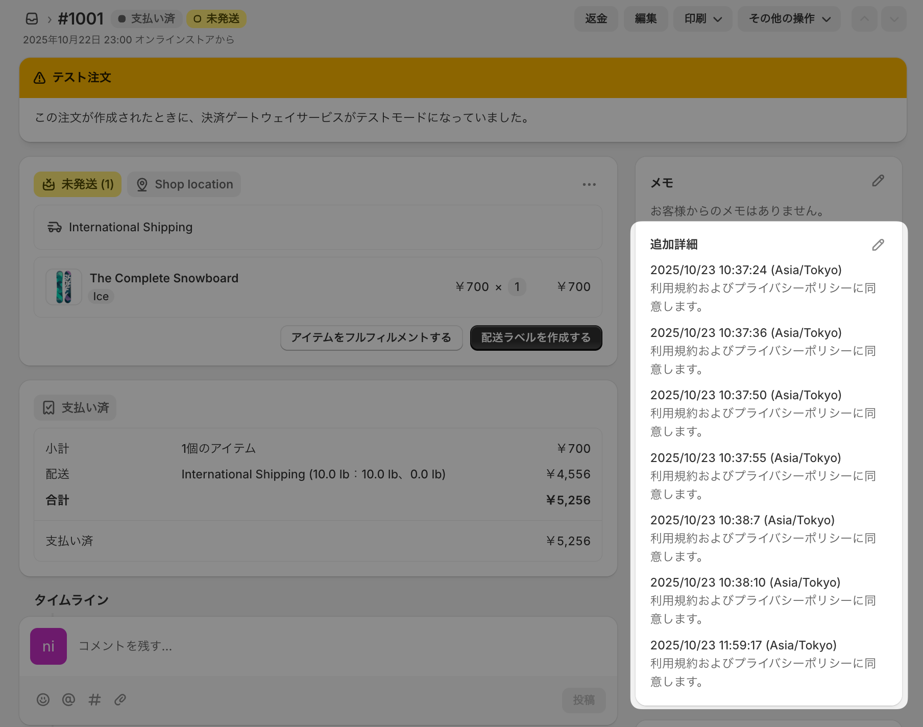 この機能はカート経由の場合のみ機能します。Shopifyの仕様上、「今すぐ購入」から購入された場合は、同意日時が保存されません。