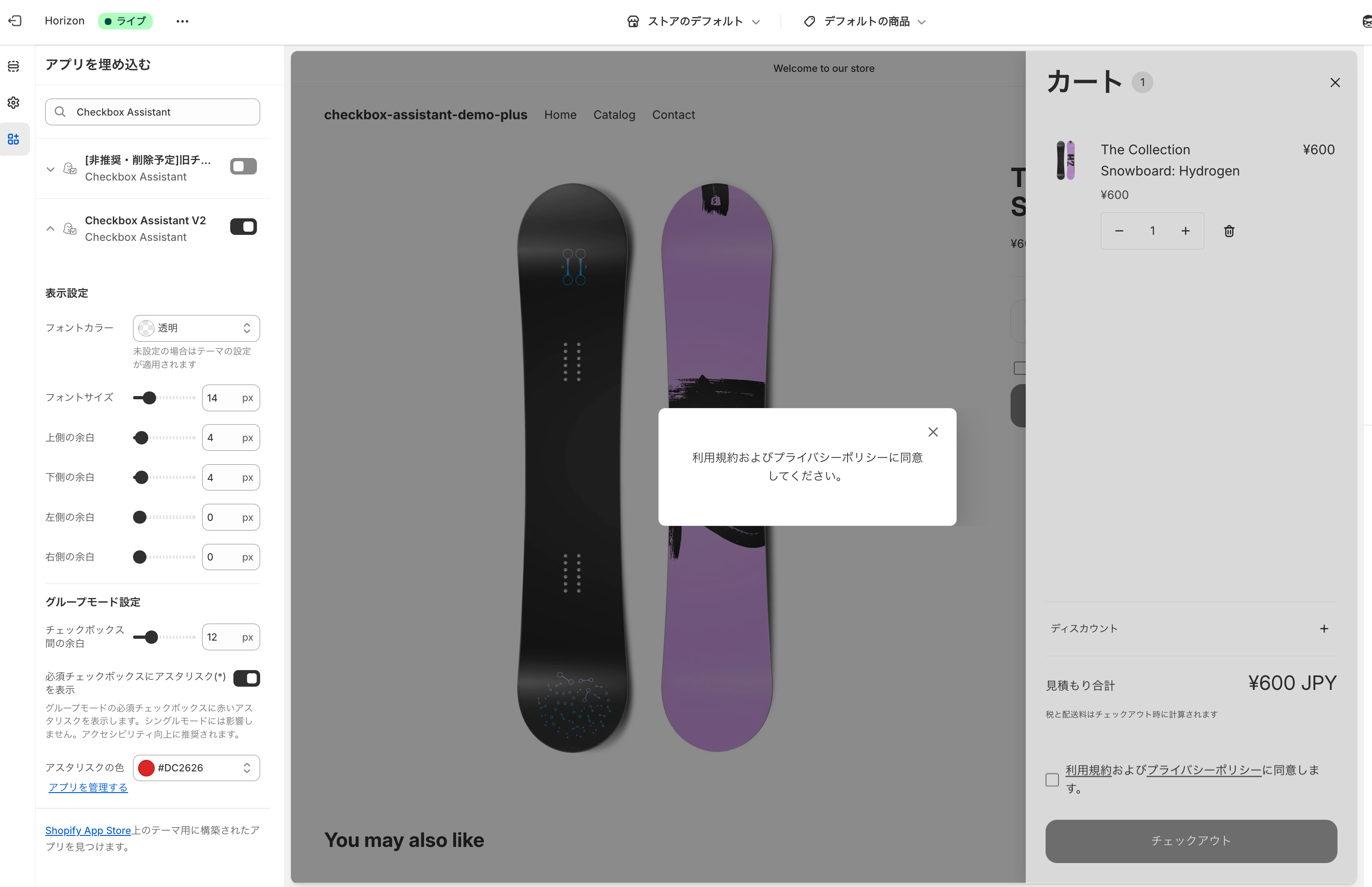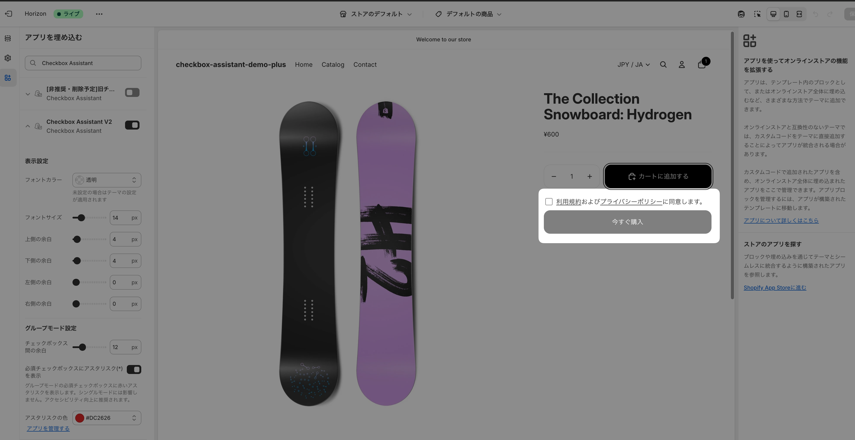 商品ページの「今すぐ購入」ボタンは、テーマエディタ画面だとアラートメッセージが確認できないので、実際のストア画面にて確認をお願いします。
