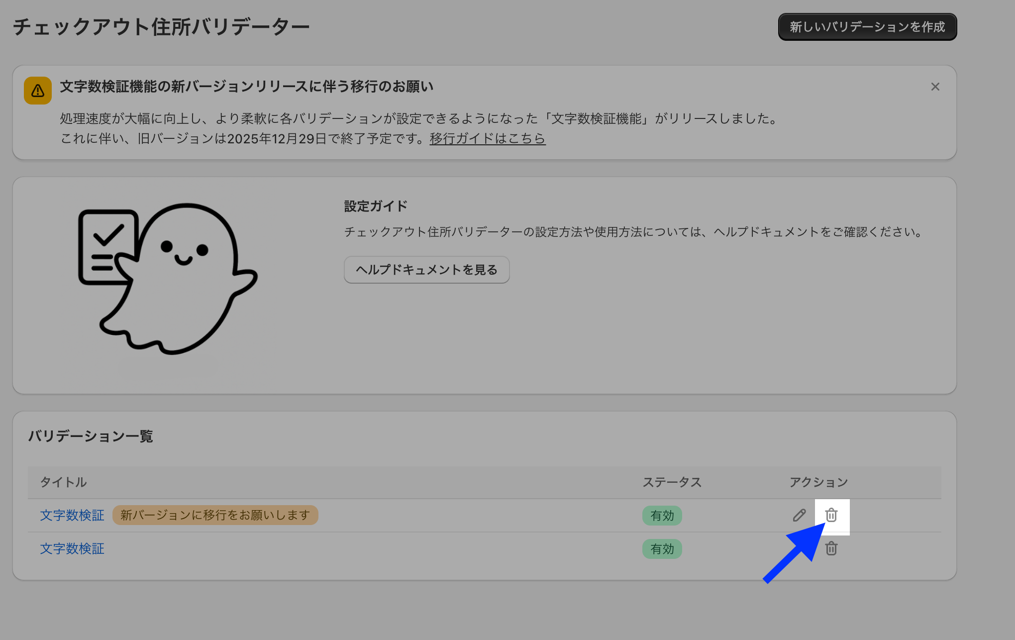 新バージョン、旧バージョンの2つが有効になっている状態だと、ユーザーには2つのエラーメッセージが表示される状態になるため、新しいバージョンを設定後はすぐに、旧バージョンを削除する必要があります。