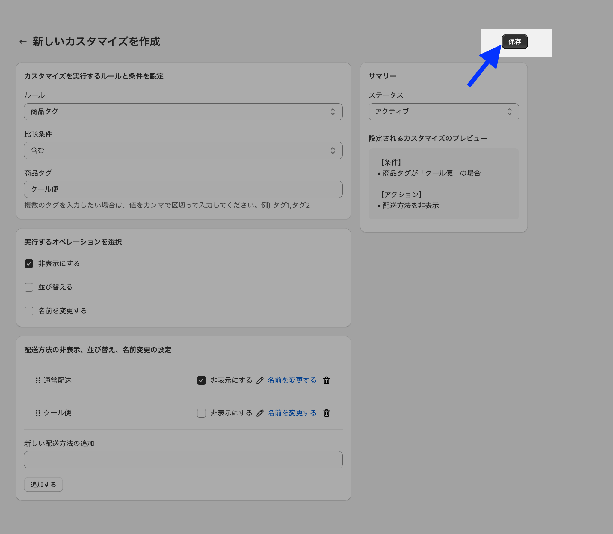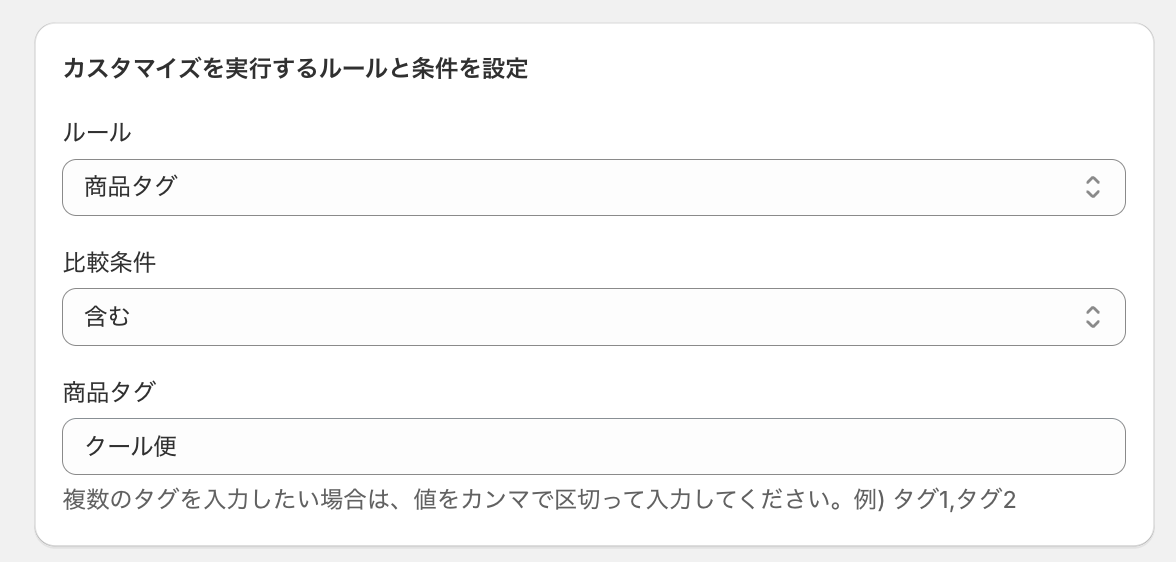 「クール便」という商品タグを含む場合という条件で設定します