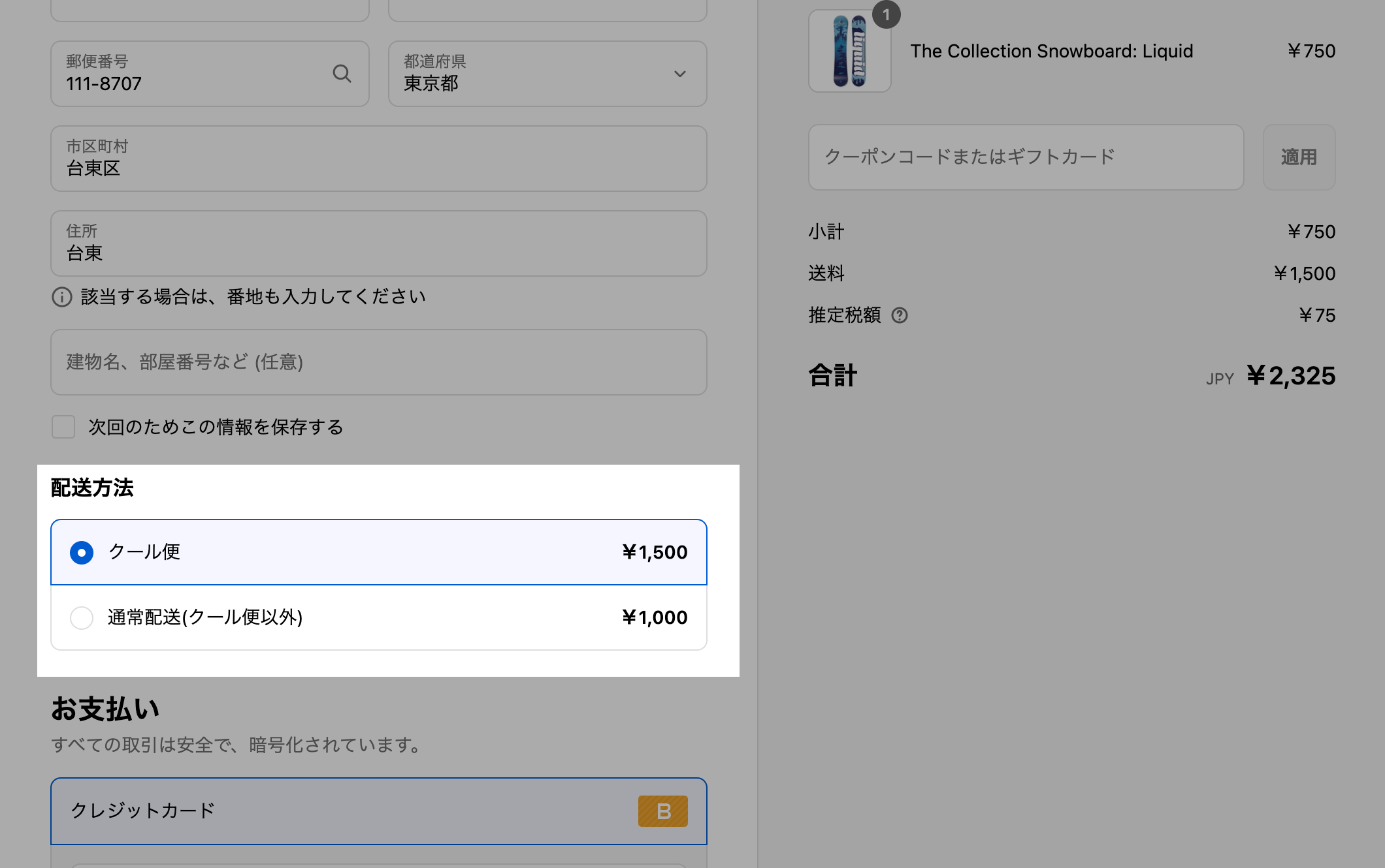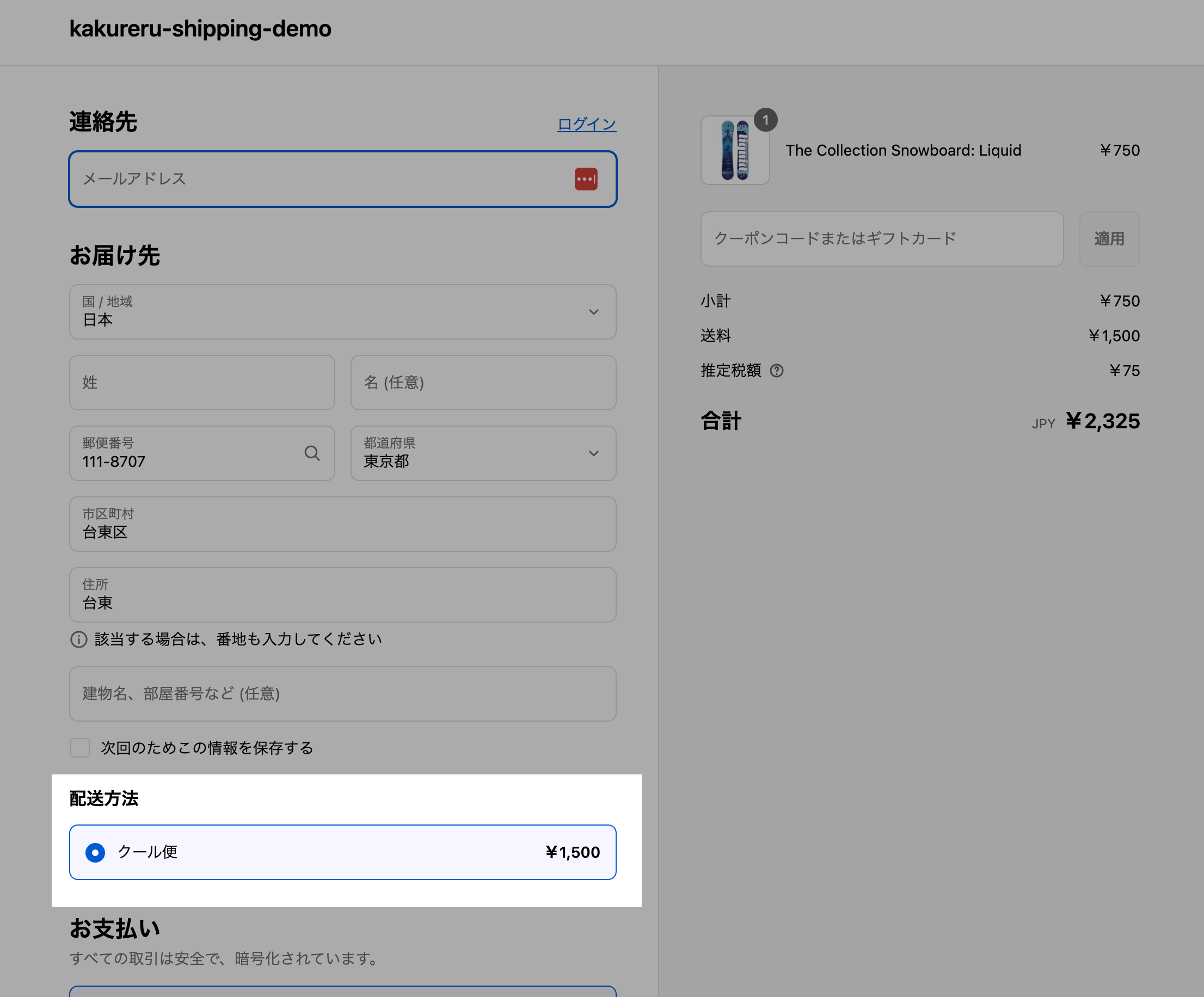 商品タグ「クール便」が付与されている商品をカートにいれてチェックアウト画面で確認