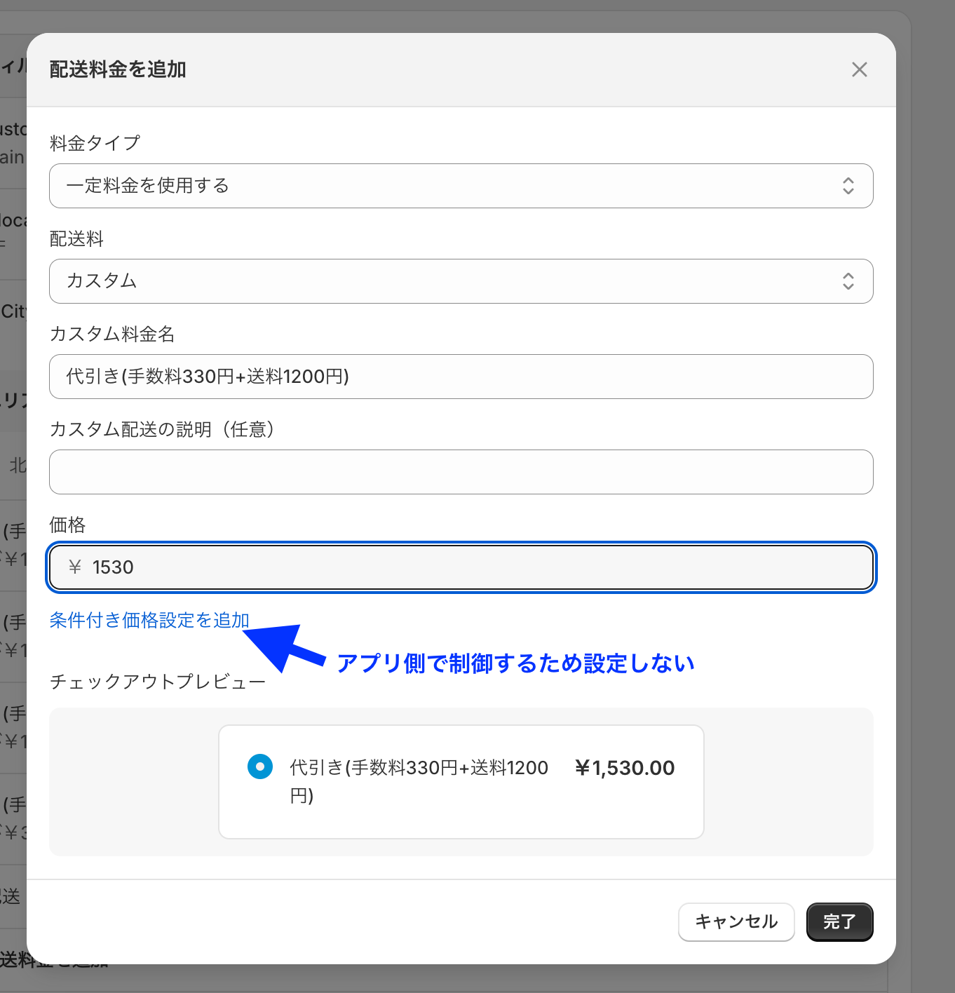 「通常配送料の配送方法名」で指定した文字を含む送料をチェックアウト画面で判定して、その金額分をカートの合計金額に足して、条件判定をします。