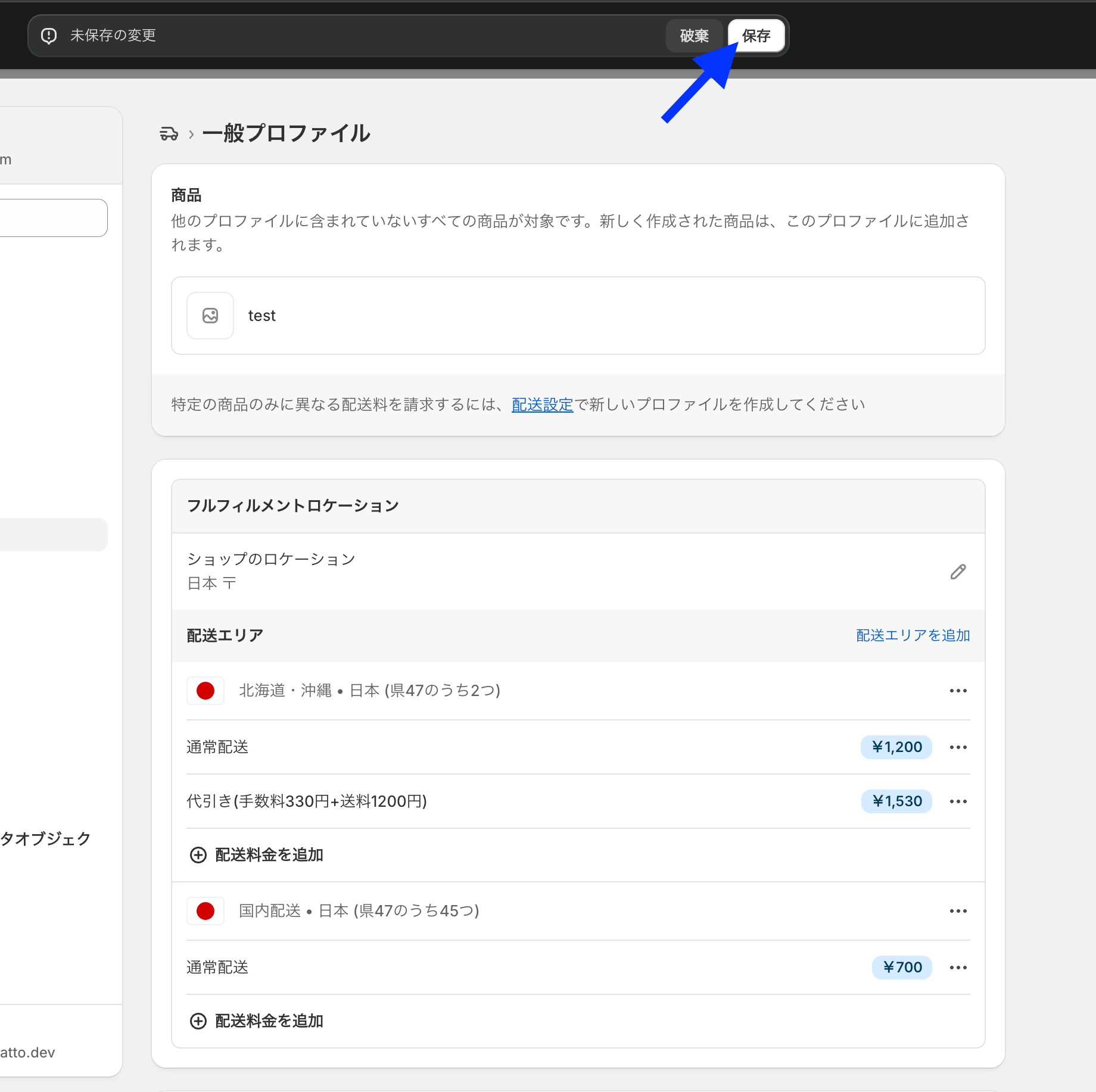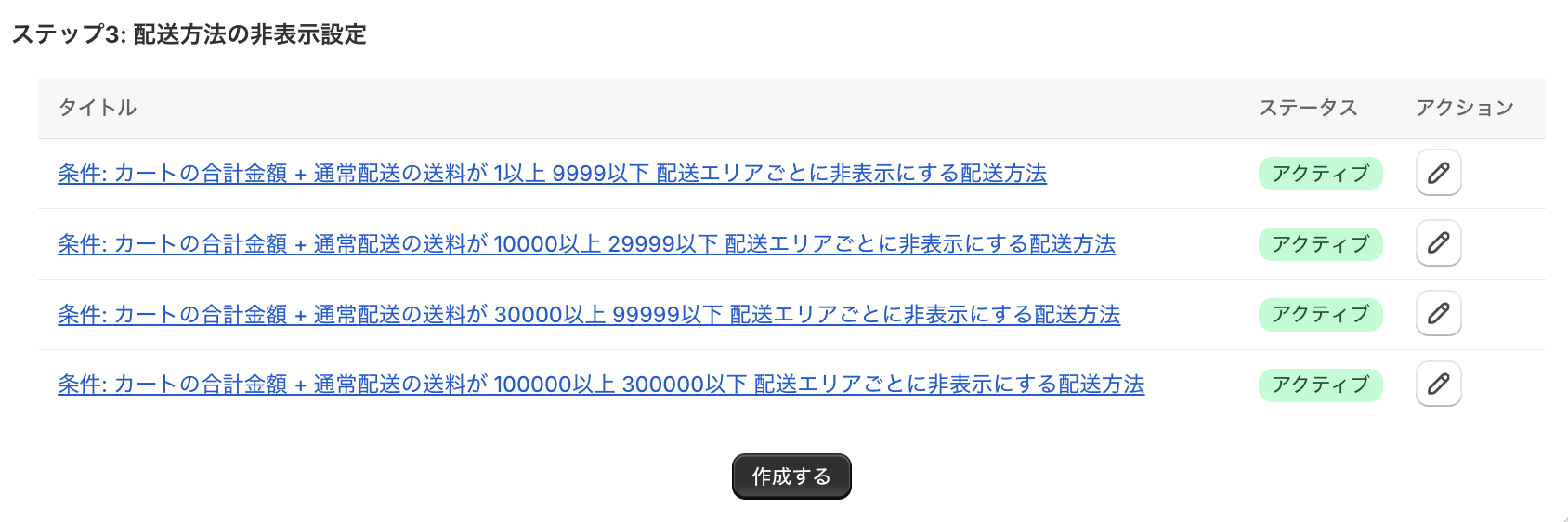 「カートの合計金額+送料」で制御するこちらの手順では、Shopify側の配送設定では、注文金額に基づく制御の設定はせずに、アプリ側で行います。