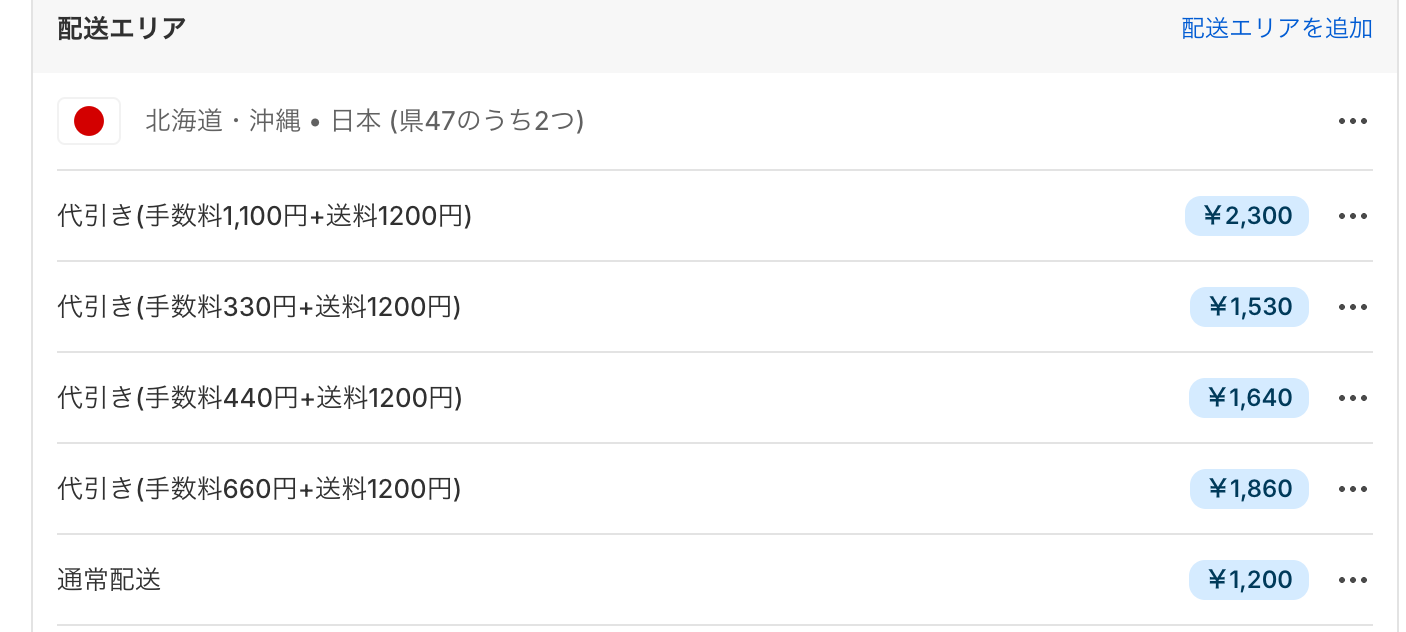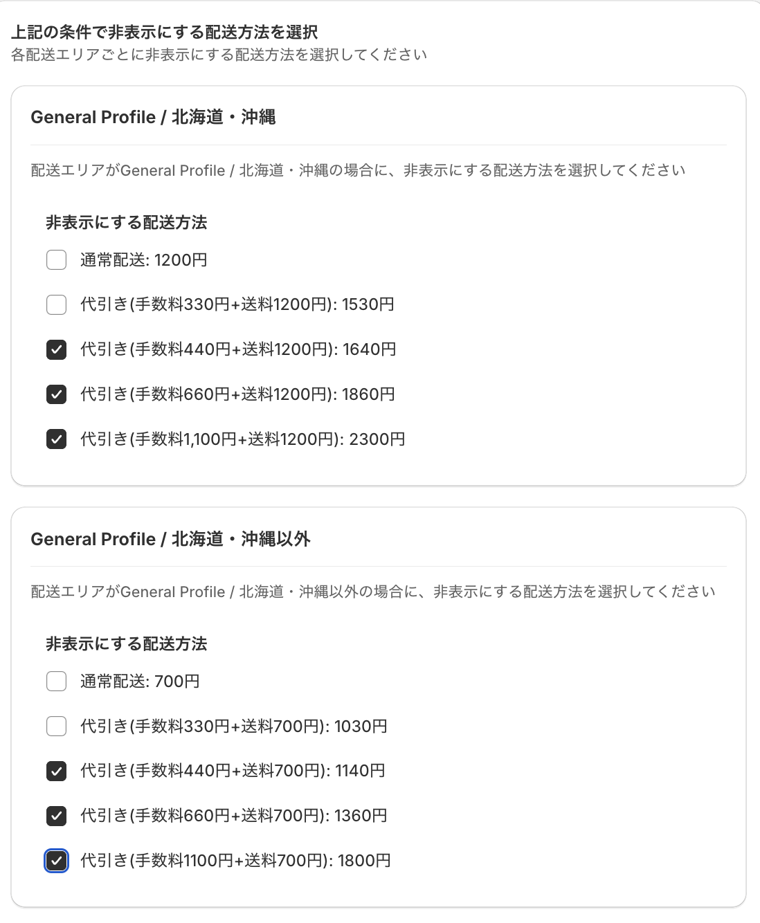 1〜9999円に該当する送料以外は全て非表示にします。