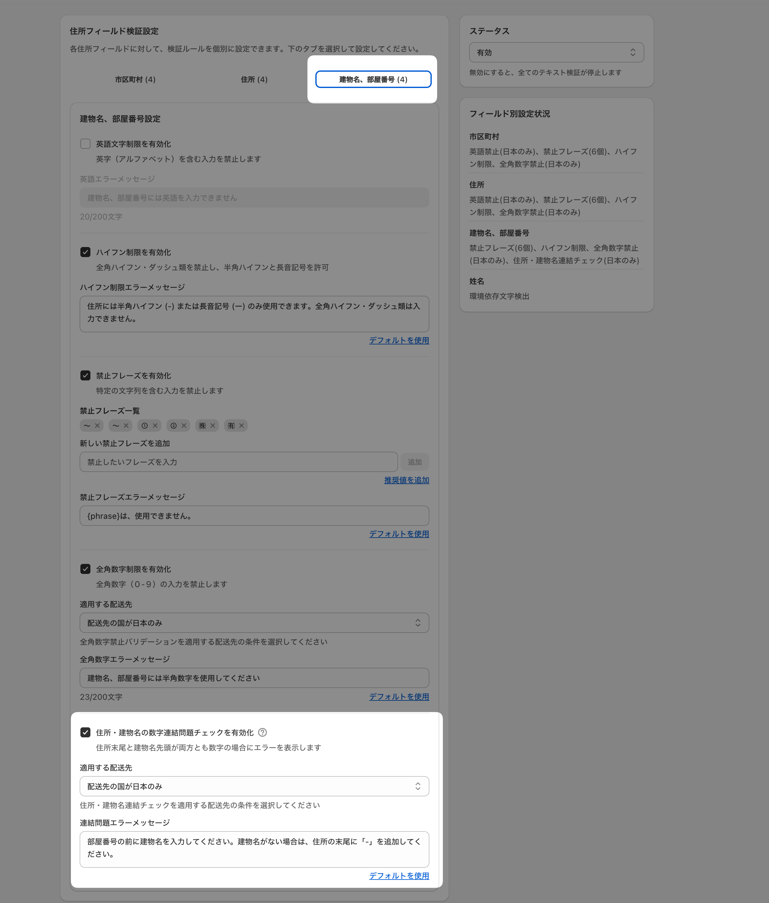 住所(番地)の末尾が数字で、かつ建物名・部屋番号の先頭も数字の場合にエラーを表示する機能を追加しました。