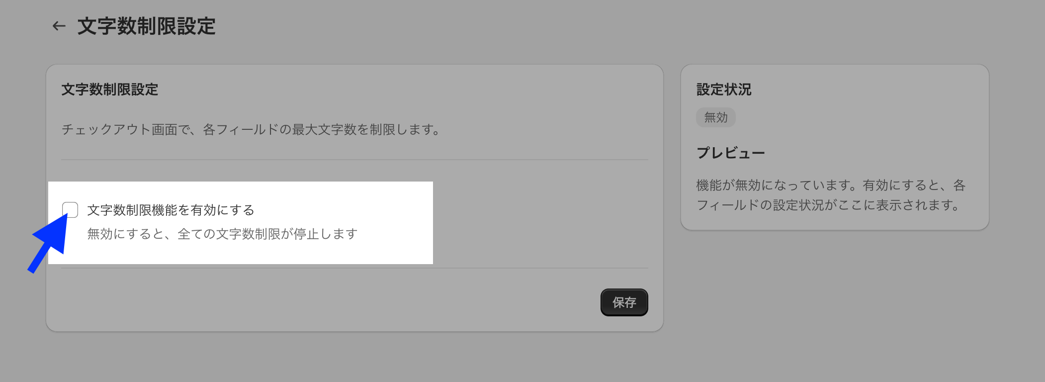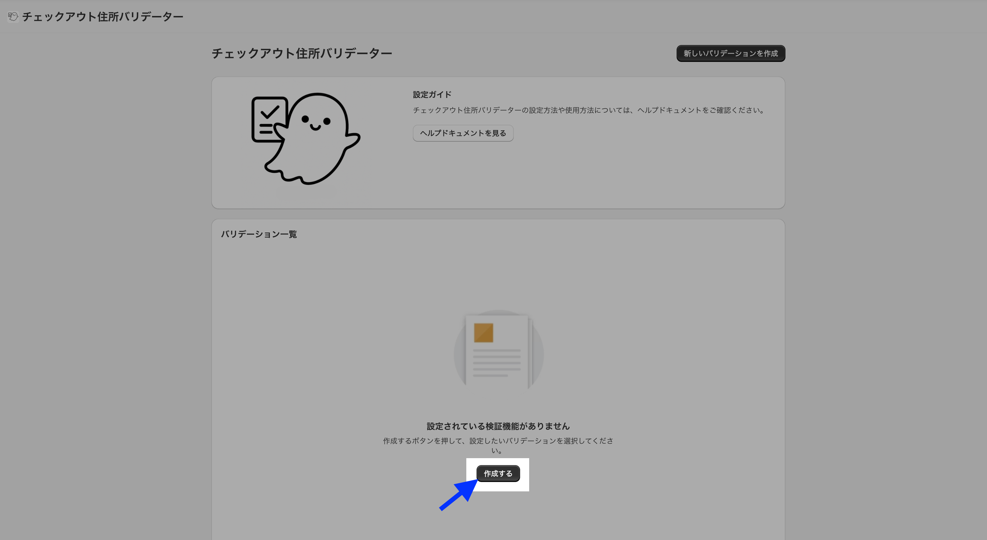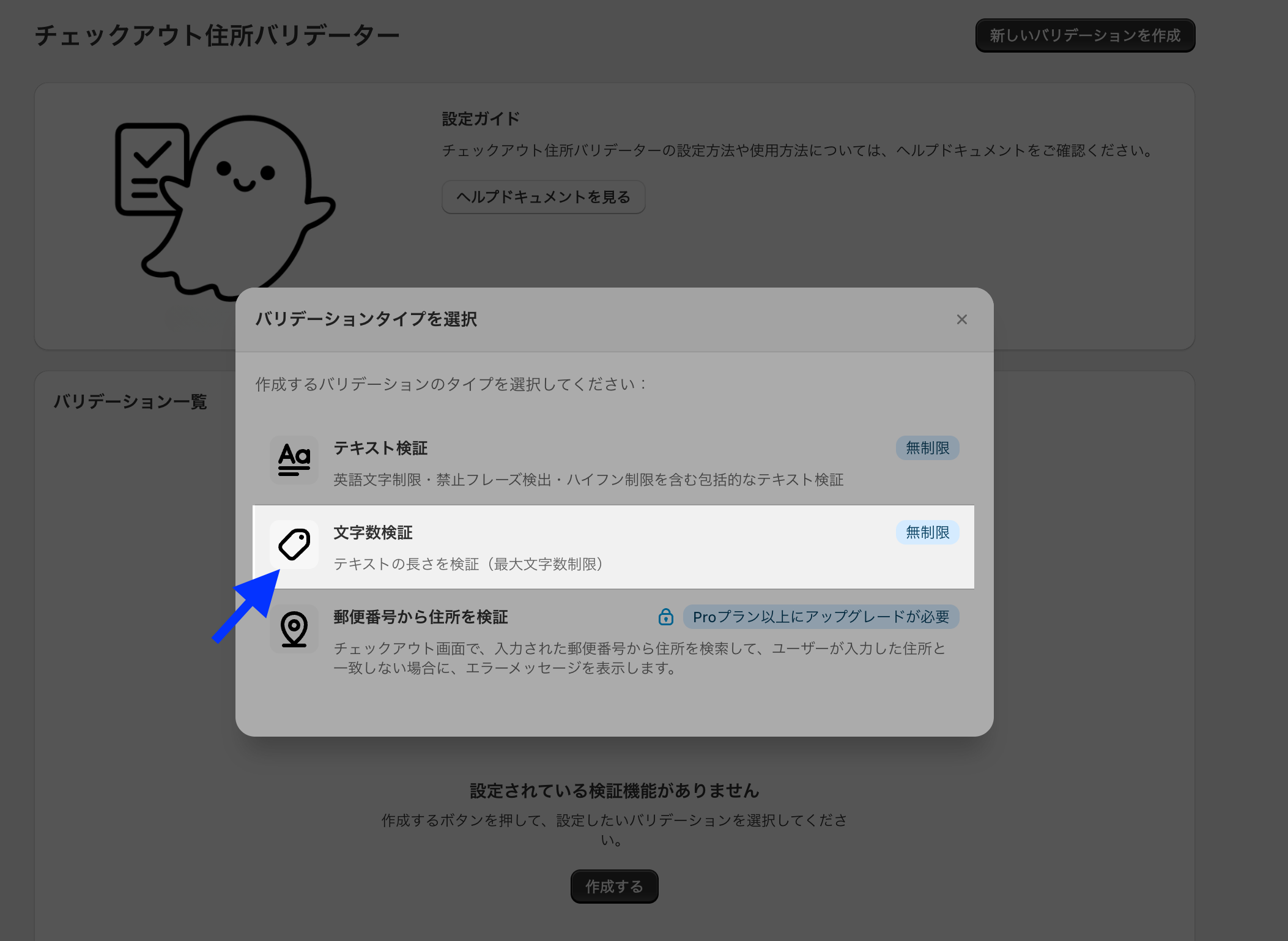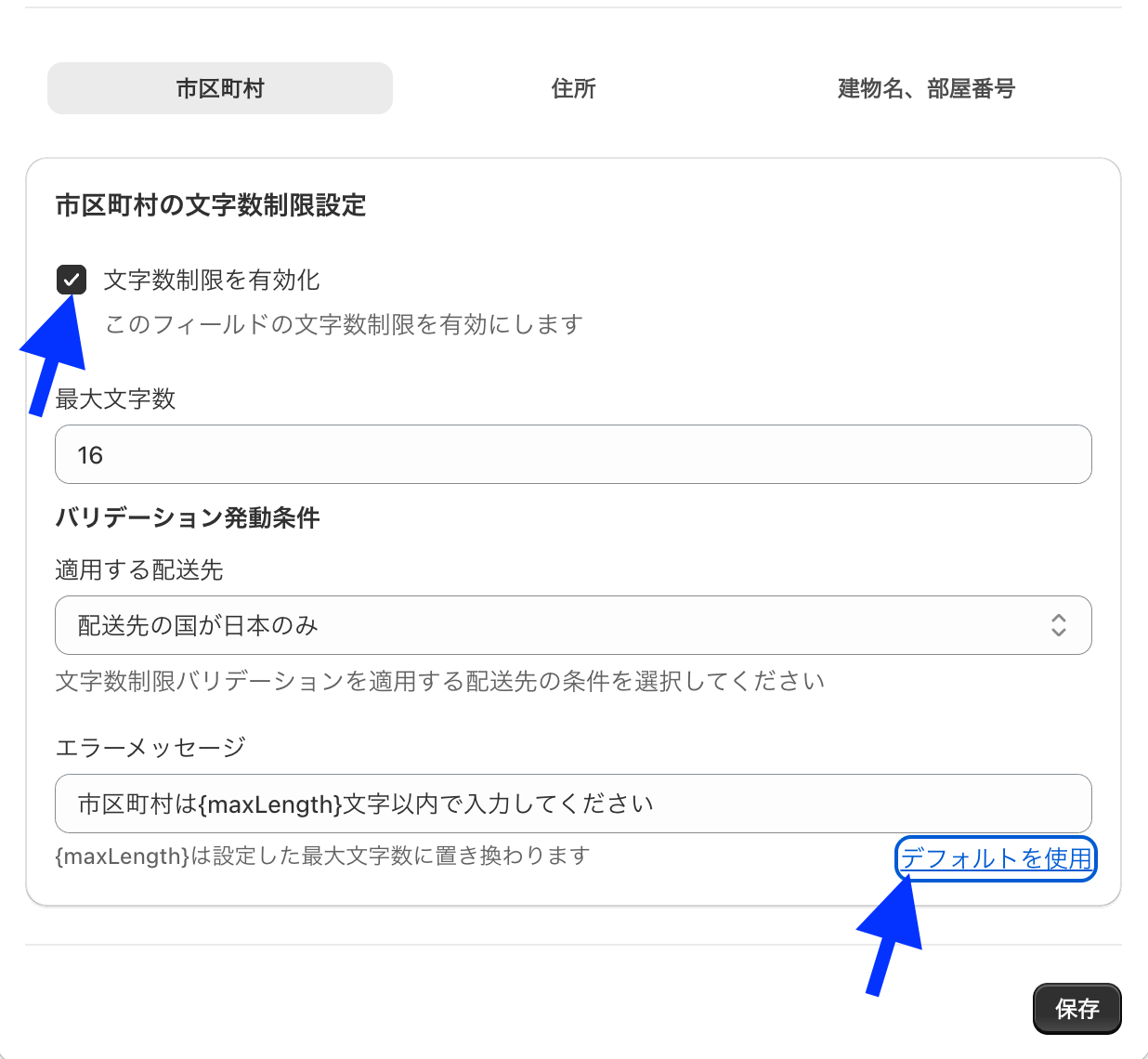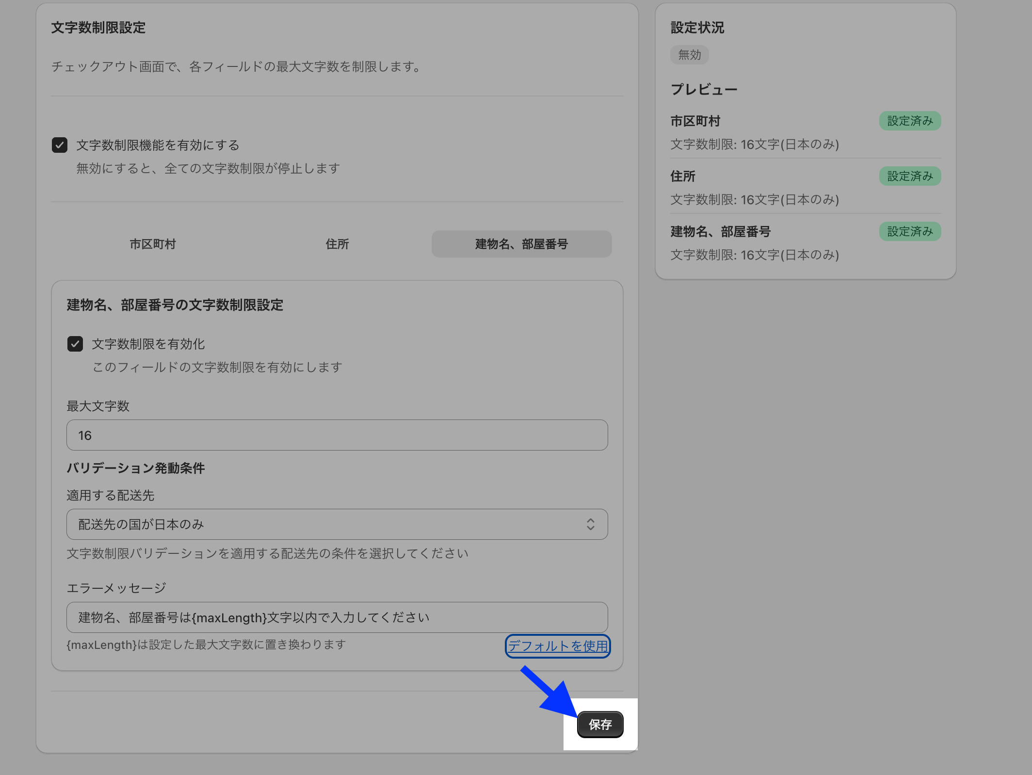 1.トップページから「作成する」ボタンをクリック2.「文字数検証」を選択する3.「文字数制限機能を有効にする」にチェックをいれる4.「市区町村」「住所」「建物名、部屋番号」について、必要な設定をする「デフォルトを使用」を押すと、デフォルトメッセージが入力されます。5.入力が完了したら、「保存」ボタンをクリック6. チェックアウト画面で、動作確認バリデーションが発動してなさそうなときは、「メールアドレス」「郵便番号」「名前(姓)」「名前(名)」を入力してから再度確認してみてください。