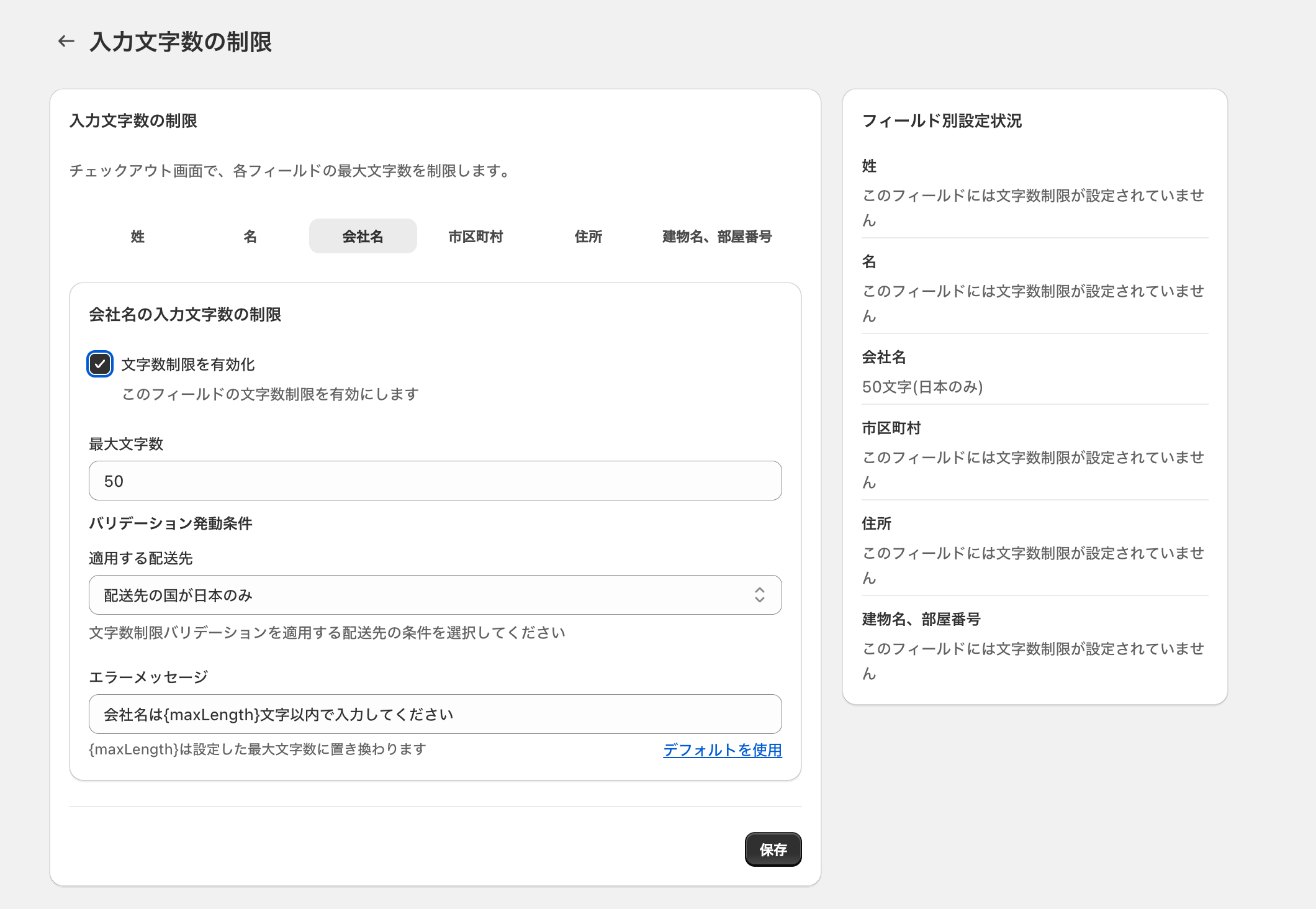 これまで姓・名や住所には文字数制限・環境依存文字検出を設定できましたが、会社名は対象外でした。法人宛の配送が多いBtoBストア様からのご要望を受け、会社名にも同様のバリデーションを追加しました。
