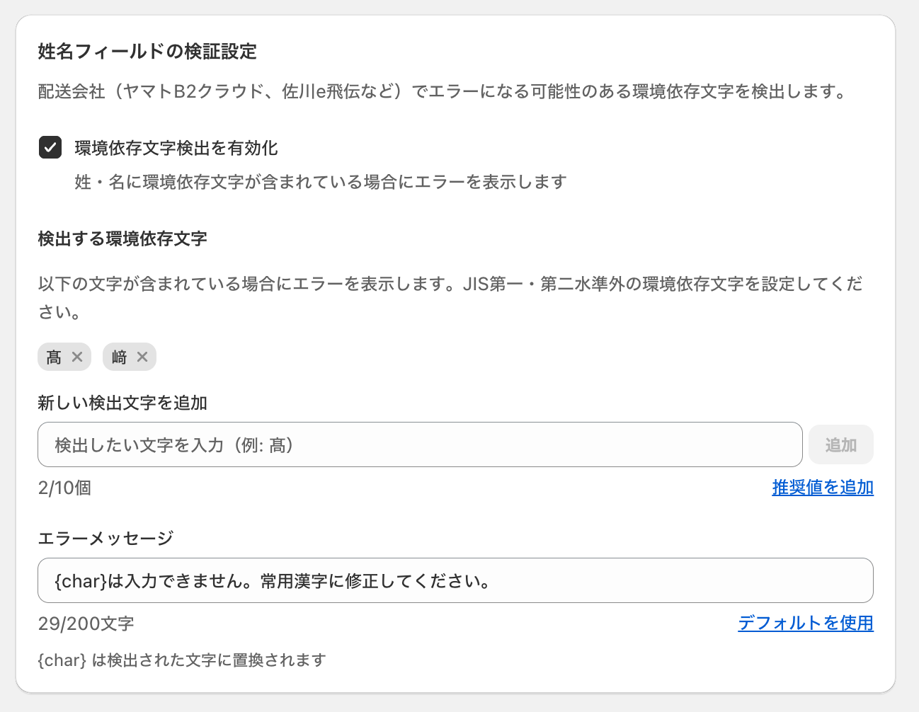 「テキスト検証」に、姓・名フィールドで環境依存文字(髙、﨑など)をブロックする機能をリリースしました。追加した背景「髙、﨑」などの環境依存文字をお客さまが入力した場合に、送り状発行システム側でエラーになることがあるため。設定方法「テキスト検証」を選択して、「環境依存文字検出を有効化」にチェックをいれて、保存。