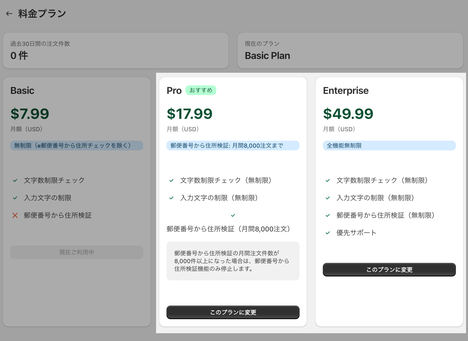 Proプランは、「郵便番号から住所検証」が月間8,000注文までご利用頂けます。